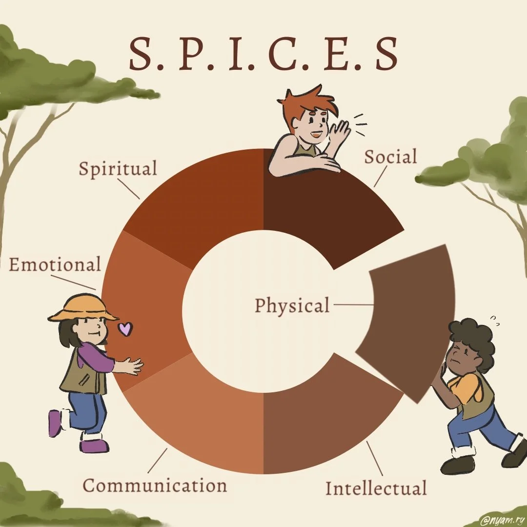 There are 6 areas of development that are all influenced at one time and not as stand alone areas. They are Social, Physical, Intellectual, Communication, Emotional and Spiritual (SPICES) (Sackville-Ford & Davenport, 2019).