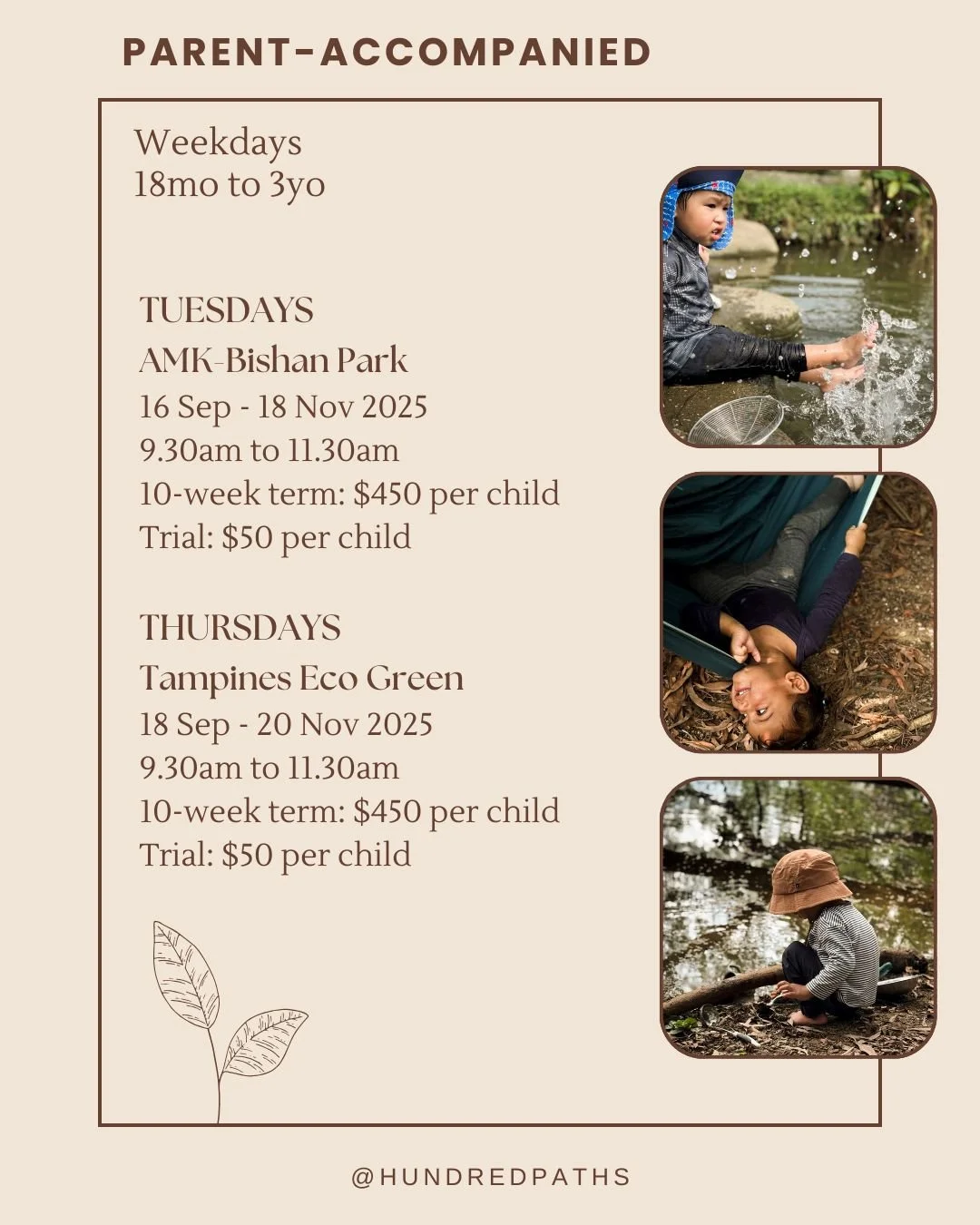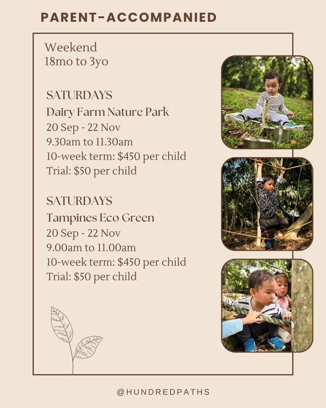 Parent accompanied sessions involve both children (18 months to 3.5 years) and their parents or caregivers participating together in various experiences in a natural outdoor setting or other natural environments. (We are naturally biased towards the forests!)